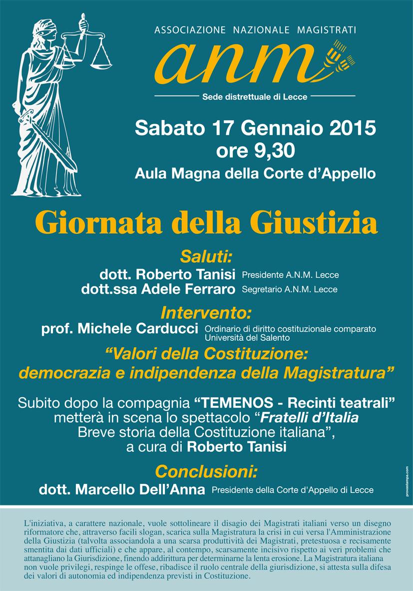 Sabato 17 gennaio 2015, dalle ore 9,30, nell'aula Magna del palazzo di Giustizia si terrà la "Giornata della Giustizia", indetta in tutta Italia dalla Giunta Esecutiva Centrale del'ANM.