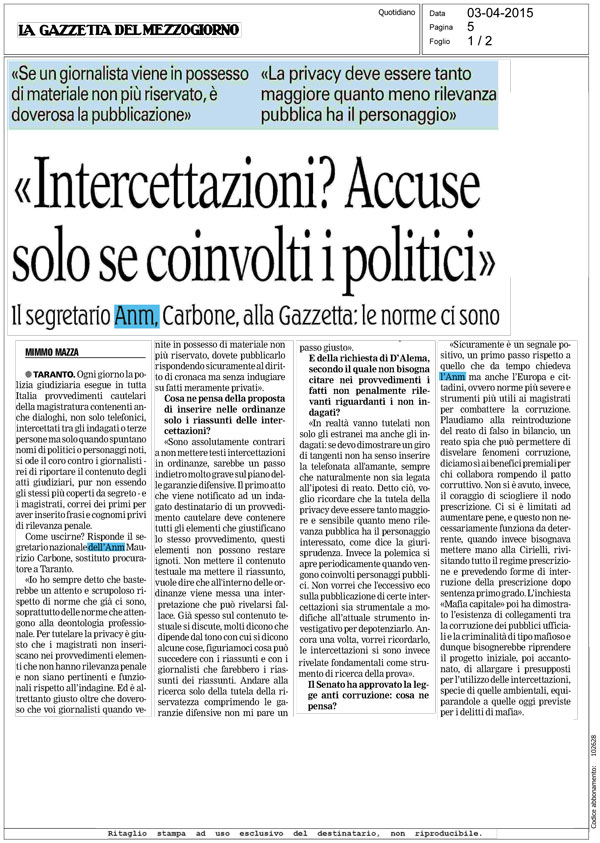 Il segretario generale dell’ANM Maurizio Carbone intervistato dalla Gazzetta del Mezzogiorno
