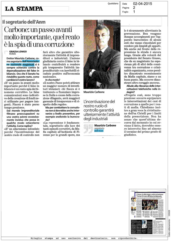 Leggi l'intervista al segretario Carbone su La Stampa del 02/04/2015