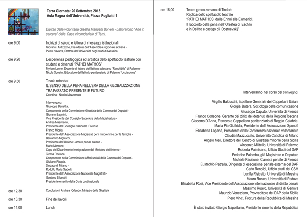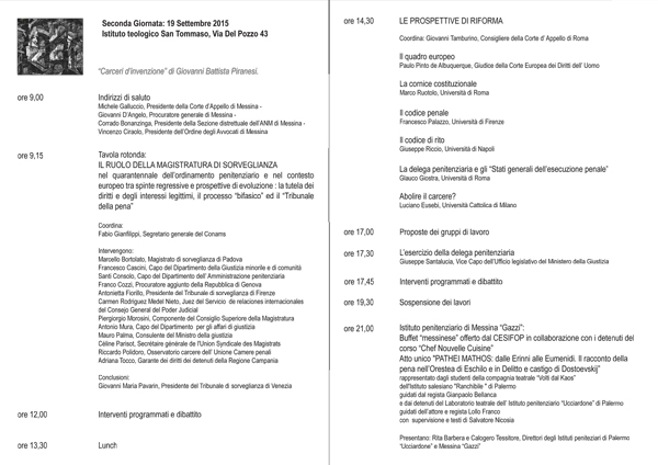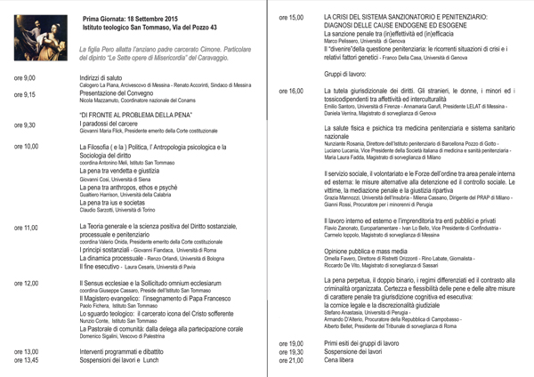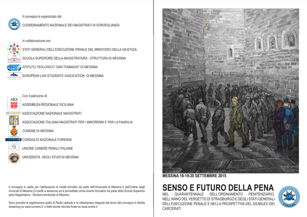 Dal 18 al 20 settembre, a Messina, si terrà il Convegno "Senso e futuro della pena" organizzato dal Coordinamento Nazionale dei Magistrati di Sorveglianza. Le prime due giornate di lavori, che prevedono numerosi interventi, si svolgeranno nell’Istituto teologico San Tommaso. Domenica 20 settembre l’evento avrà luogo nell’Aula Magna dell’Università. Chiuderà il Convegno la tavola rotonda “Il senso della pena nell’era della globalizzazione tra passato, presente e futuro” moderata da Nicola Mazzamuto, coordinatore nazionale del CONAMS. Parteciperanno: Giuseppe Berretta, componente della commissione Giustizia della Camera, Giovanni Legnini, vicepresidente del Consiglio Superiore della Magistratura, Andrea Mascherin, presidente del Consiglio Nazionale Forense, Franco Micela, presidente dell’Associazione Magistrati per i minorenni e per la famiglia, Beniamino Migliucci, presidente dell’Unione Camere penali italiane, Mario Morcone, capo del Dipartimento Immigrazione del ministero dell’Interno, Teresa Piccione, componente della Commissione Affari sociali della Camera, Giuliano Pisapia, sindaco di Milano,  Rodolfo Maria Sabelli, presidente dell’Associazione Nazionale Magistrati, Gaetano Silvestri, presidente emerito della Corte costituzionale. Concluderà il ministro della Giustizia Andrea Orlando.