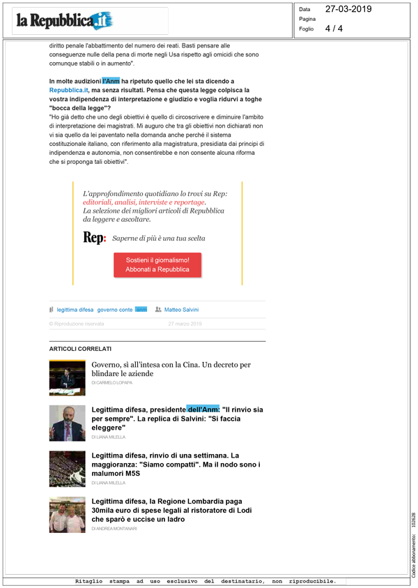 "La riforma amplia eccessivamente l'istituto della legittima difesa. L'attuale norma, già modificata nel 2006 (governo Berlusconi, Guardasigilli il leghista Roberto Castelli, ndr), già copre a sufficienza tutto lo spettro della legittimità della difesa contro un offesa ingiusta".