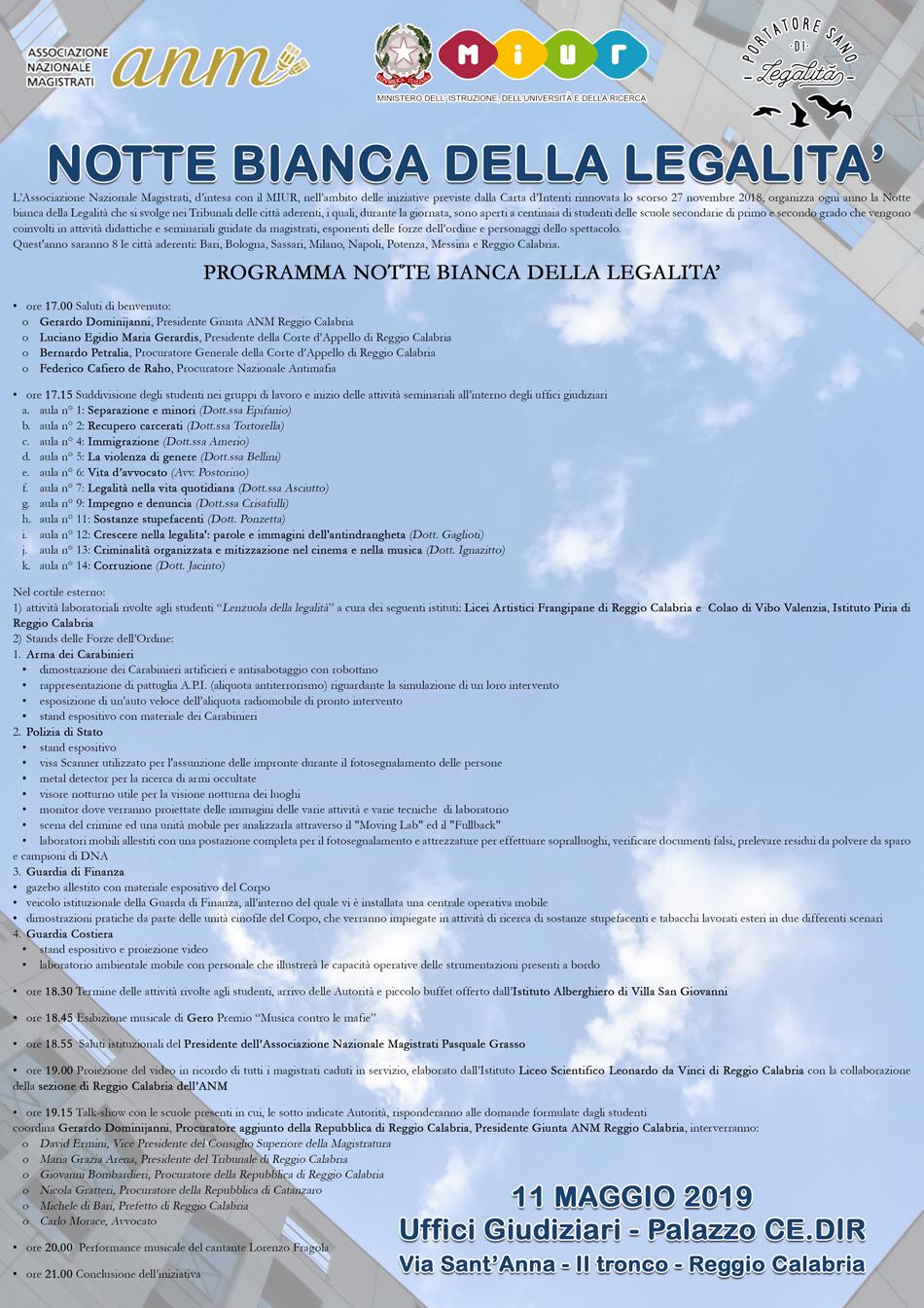 “La Notte Bianca della Legalità – spiega il presidente dell’Associazione Nazionale Magistrati Pasquale Grasso che sabato sarà a Reggio Calabria – è un’iniziativa significativa e importante da molti punti di vista. È un’occasione, inoltre, per restituire ai ragazzi un messaggio di fiducia nei confronti dei magistrati, servitori dello Stato, a garanzia dei diritti di tutti”.