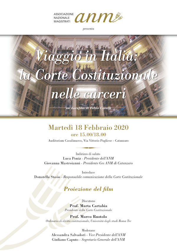 Catanzaro si trasforma nella capitale dei diritti. Accadrà il 18 e 19 febbraio con le iniziative dell’Associazione Nazionale Magistrati e la presenza di rappresentanti della Corte Costituzionale. In particolare, martedì 18 febbraio, l’Auditorium Casalinuovo ospiterà la proiezione del docufilm “Viaggio in Italia: la Corte Costituzionale nelle carceri”. Sette giudici della Corte Costituzionale incontrano i detenuti di sette Istituti penitenziari italiani: Rebibbia a Roma, San Vittore a Milano, il carcere minorile di Nisida, Sollicciano a Firenze, Marassi a Genova, Terni, Lecce sezione femminile. Per la prima volta dalla sua nascita, nel 1956, la Corte Costituzionale decide di entrare in carcere. Il film è il racconto di quell’incontro, dell’incontro con l’umanità che vive marginalità sociale. Un viaggio fatto di confronto, dialogo ed emozioni. Alla proiezione interverrà la presidente della Corte Costituzionale Prof. Marta Cartabia. Prima della proiezione, gli indirizzi di saluto del presidente dell’Anm Luca Poniz e della presidente della Ges Anm di Catanzaro Giovanna Mastroianni; l’introduzione è affidata a Donatella Stasio, responsabile della comunicazione della Corte Costituzionale. A seguire la riflessione con la presidente della Corte Costituzionale Prof. Marta Cartabia, il professor Marco Ruotolo, ordinario di Diritto costituzionale all’Università Roma Tre; il segretario dell’Anm Giuliano Caputo e la vice presidente dell’Anm Alessandra Salvadori. Parteciperanno i docenti e gli studenti degli istituti superiori e della facoltà di Giurisprudenza di Catanzaro. La due giorni di Catanzaro sarà anche l’occasione per un incontro a cui l’Associazione Nazionale Magistrati tiene particolarmente. La Giunta Esecutiva Centrale e il presidente dell’Anm Luca Poniz incontreranno i colleghi calabresi che ogni giorno, e nonostante le tante difficoltà, testimoniano impegno e rappresentano presidii di legalità sul territorio.