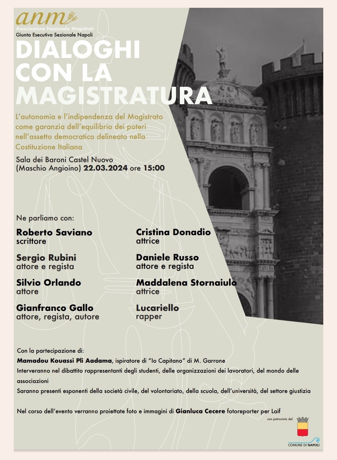 L’autonomia e l’indipendenza del magistrato come garanzia dell’equilibrio dei poteri nell’assetto democratico delineato nella Costituzione italiana. Questo il tema dell’incontro a Napoli, in programma al Maschio Angioino all’interno del ciclo ‘Dialoghi con la magistratura’, organizzato dalla Giunta esecutiva sezionale di Napoli dell’ANM.