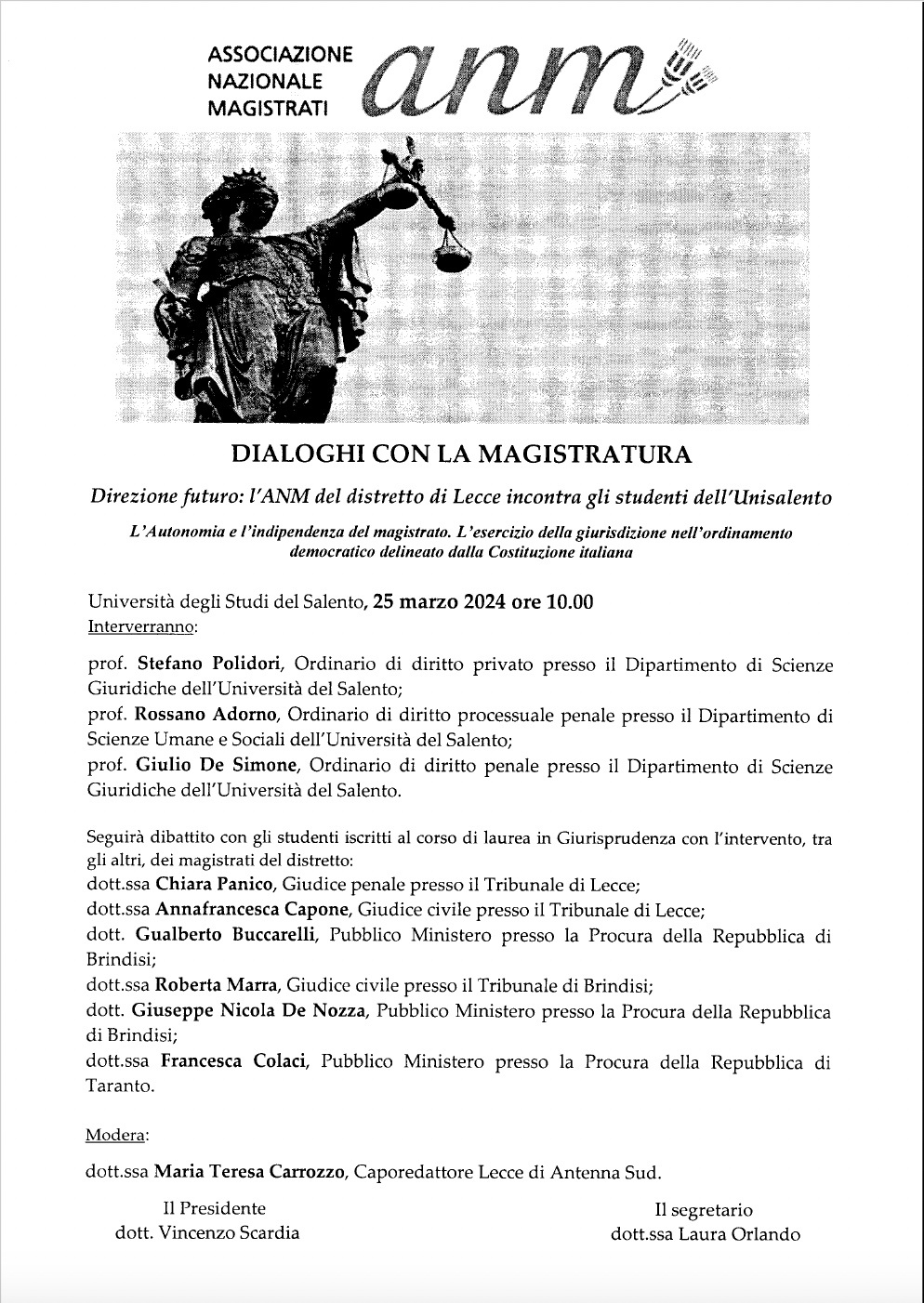 Per il ciclo di incontri “Dialoghi con la magistratura” l’ANM di Lecce organizza il convegno “L’autonomia e l’indipendenza del magistrato. L’esercizio della giurisdizione nell’ordinamento democratico delineato nella Costituzione italiana”. Professori e magistrati dialogheranno con gli studenti della facoltà di giurisprudenza moderati da Maria Teresa Carrozzo, caporedattore Lecce di Antenna Sud.