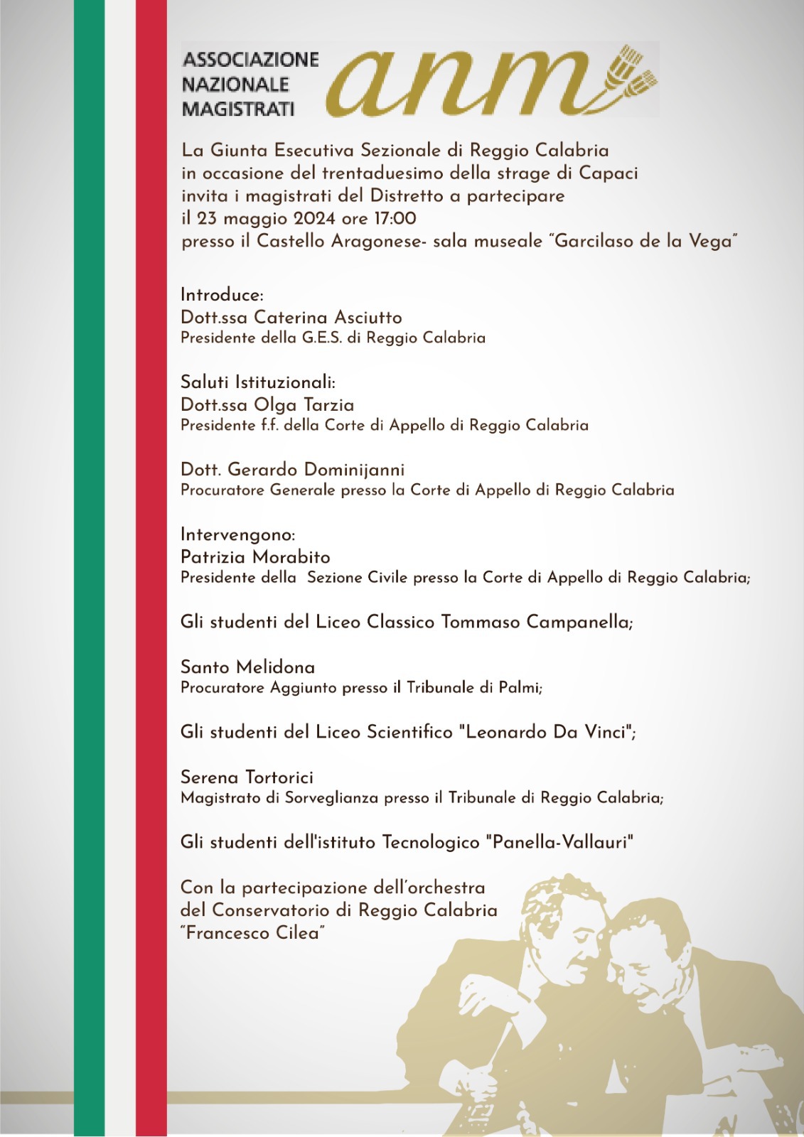 In occasione del trentaduesimo anniversario della strage di Capaci, la Ges di Reggio Calabria organizza un convegno alla presenza di magistrati e studenti delle scuole superiori, con la partecipazione dell’orchestra del Conservatorio di Reggio Calabria “Francesco Cilea”.