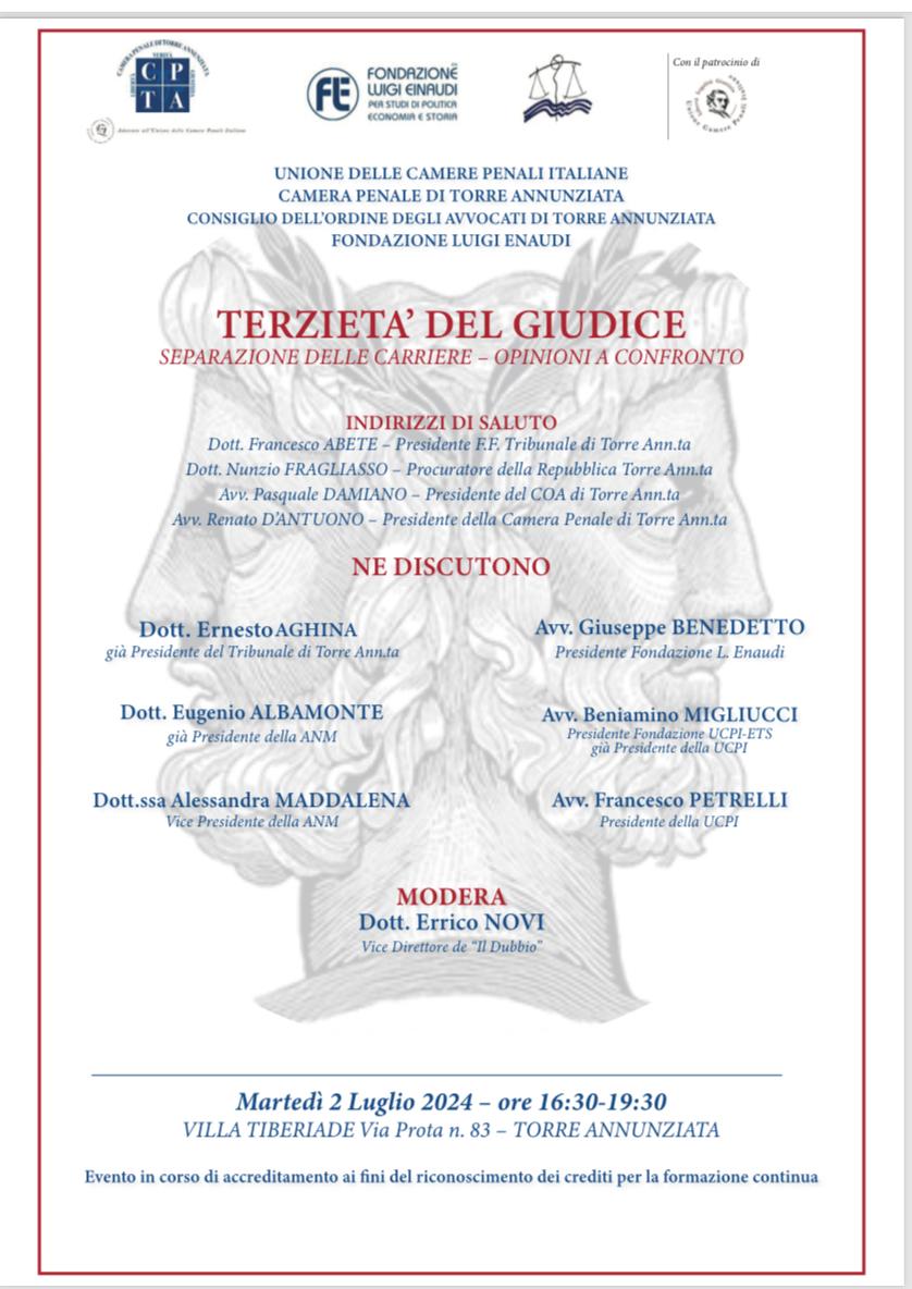 “Terzietà del giudice. Separazione delle carriere – opinioni a confronto” è il titolo del convegno organizzato dall'Unione delle Camere penali italiane, la Camera penale di Torre Annunziata, il Consiglio dell'Ordine degli avvocati di Torre Annunziata e la Fondazione Luigi Einaudi.
