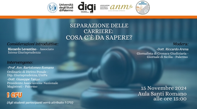 “Separazione delle carriere: cosa c’è da sapere”, questo il titolo del convegno organizzato dal dipartimento di Giurisprudenza dell’Università di Palermo insieme alla sezione distrettuale di Palermo dell’Anm e l’associazione universitaria Intesa Giurisprudenza. Una riflessione volta a chiarire tutti gli aspetti della riforma in un momento di confronto e approfondimento. Durante l’evento, dopo l’introduzione di Riccardo Levantino (Intesa Giurisprudenza), interverranno Bartolomeo Romano, ordinario di diritto penale, e il presidente della Ges dell’Anm di Palermo Giuseppe Tango, moderati dal giornalista Riccardo Arena.