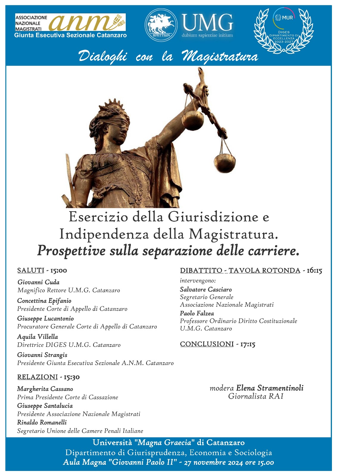 “Esercizio della giurisdizione e indipendenza della magistratura. Prospettive sulla separazione delle carriere”, è questo il tema di un nuovo appuntamento con i Dialoghi con la magistratura. L’incontro si tiene mercoledì 27 novembre all’Università Magna Graecia di Catanzaro con gli interventi, tra gli altri, di Giuseppe Santalucia e Salvatore Casciaro.