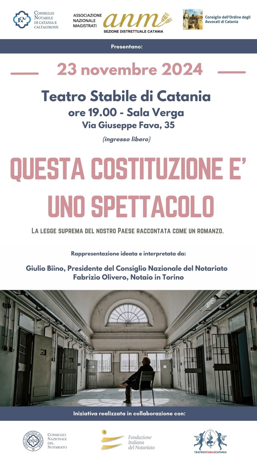 “Questa Costituzione è uno spettacolo” è un esperimento di teatro didattico nel quale, tramite letture, riflessioni e contributi video, si racconta la storia e il senso della Costituzione repubblicana. Protagonisti sono Giulio Biino, presidente del Consiglio Nazionale del Notariato, e Fabrizio Oliviero, notaio torinese.