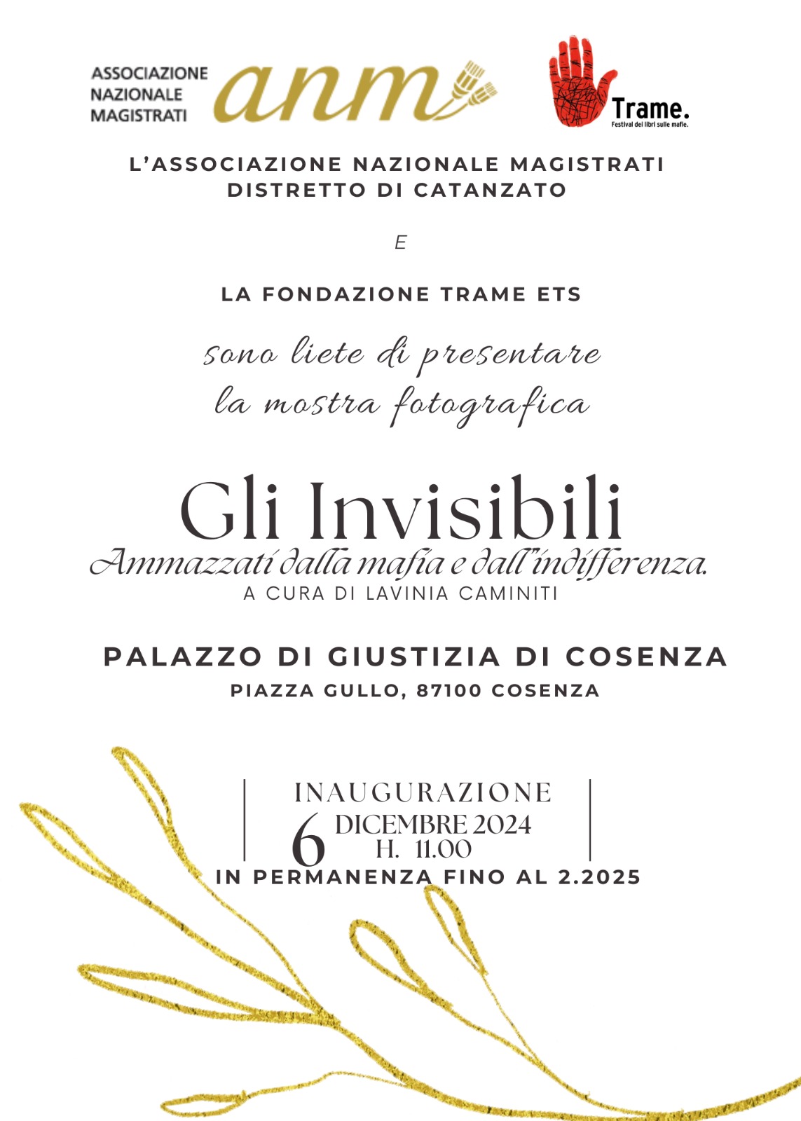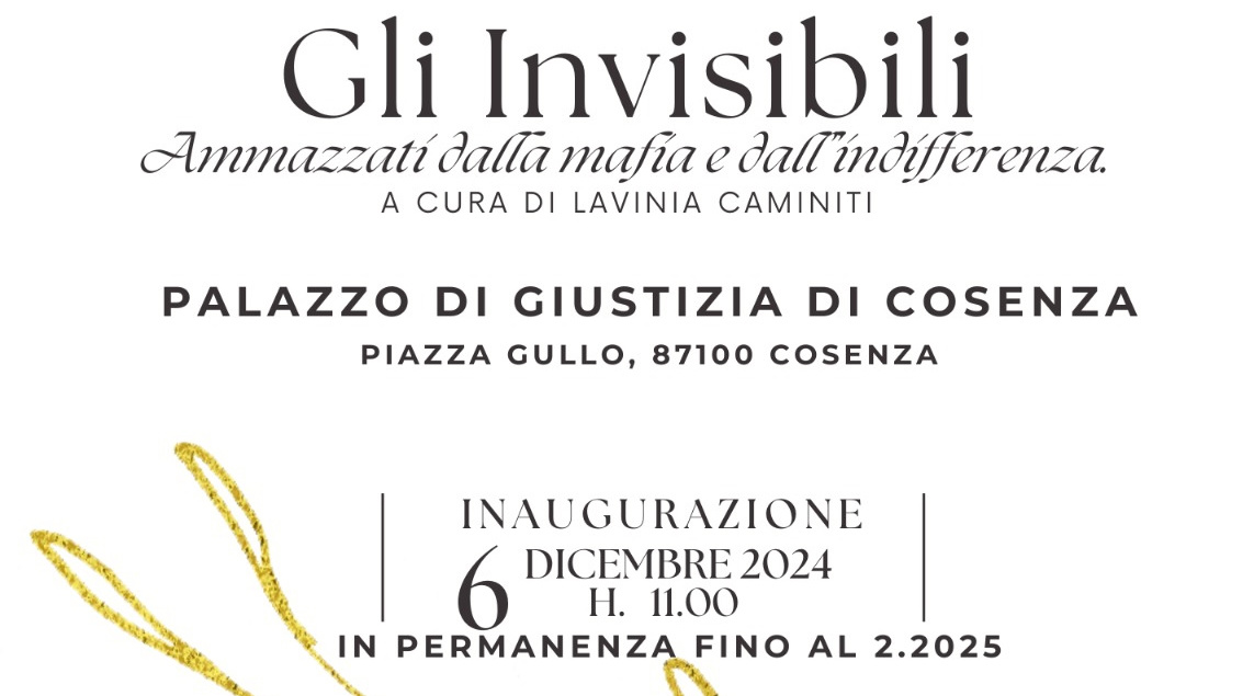 La Giunta Anm di Catanzaro insieme alla Fondazione Trame Ets inaugurano venerdì 6 dicembre la mostra a cura di Lavinia Caminiti "Gli invisibili. Ammazzati dalla mafia e dall'indifferenza". Il percorso espositivo racconta le vittime della mafia e i luoghi dimenticati in cui avvennero quelle tragedie con l'intento di mantenere viva, sempre, la memoria collettiva. L'esposizione fotografica sarà visitabile al Palazzo di giustizia di Cosenza fino a febbraio 2025.
