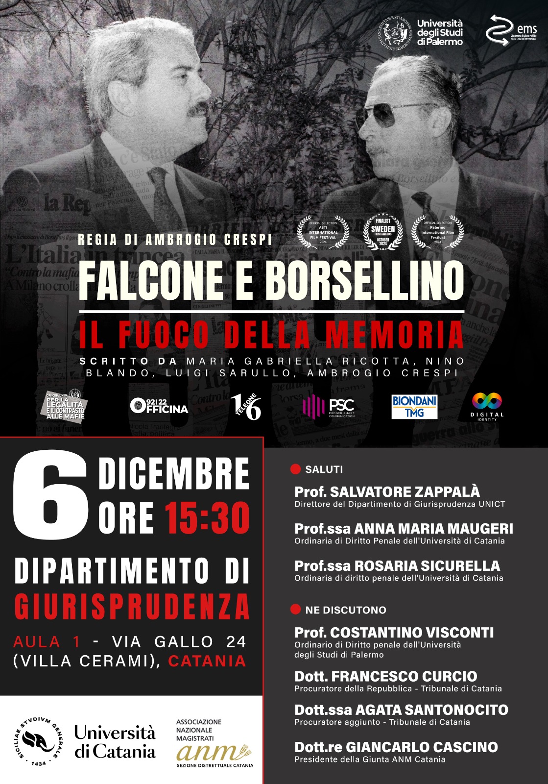 L'evento, promosso dalla Ges Anm di Catania e dall'ateneo, prevede la proiezione del docufilm "Falcone e Borsellino. Il fuoco della memoria", realizzato dall'Università di Palermo con la regia di Ambrogio Crespi. A seguire un dibattito che vede protagonisti docenti e magistrati.
