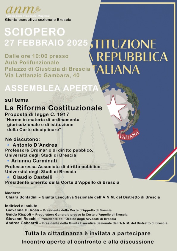 Lo sciopero dei magistrati del 27 febbraio vedrà numerosi incontri in tutta Italia per informare e sensibilizzare i cittadini sul ddl Nordio. Il distretto Anm di Brescia organizza un’assemblea aperta presso il Palazzo di giustizia che affronterà il tema della riforma costituzionale con un focus particolare sul disegno di legge C. 1917, concernente le "Norme in materia di ordinamento giurisdizionale e di istituzione della Corte disciplinare".