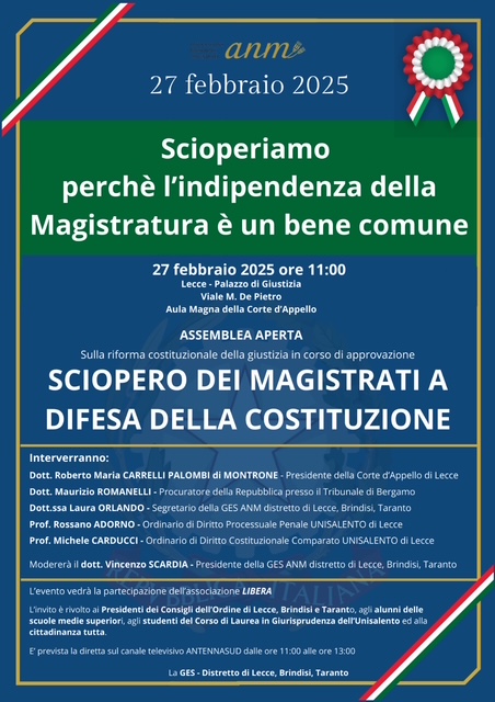 Lo sciopero dei magistrati del 27 febbraio prevede anche a Lecce, come in tutta Italia, un momento di confronto con la cittadinanza sulla riforma della giustizia presso l'Aula Magna della Corte d'appello, alle 11.
