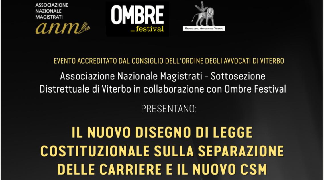 La sottosezione distrettuale di Viterbo dell'Associazione nazionale magistrati, in collaborazione con Ombre Festival, organizza un incontro pubblico in piazza della Repubblica, a Viterbo, per informare e sensibilizzare i cittadini sulla riforma della giustizia attualmente in discussione al Parlamento. Titolo del dibattito: "Il nuovo disegno di legge costituzionale sulla separazione delle carriere e il nuovo Csm".
