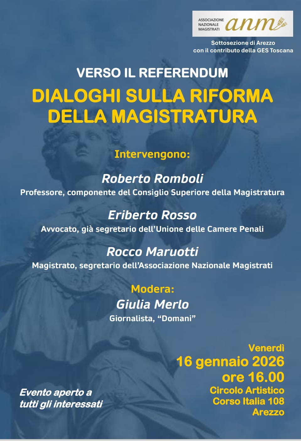 La sottosezione Anm di Arezzo, con il contributo della Ges Toscana, promuove un evento di approfondimento sul referendum sulla giustizia, “Dialoghi sulla riforma della magistratura”, con la partecipazione del segretario dell’Anm Rocco Maruotti. Intervengono il prof. Roberto Romboli, componente del Csm, ed Eriberto Rosso, già segretario dell’Unione delle Camere penali. Modera Giulia Merlo, giornalista del “Domani”.